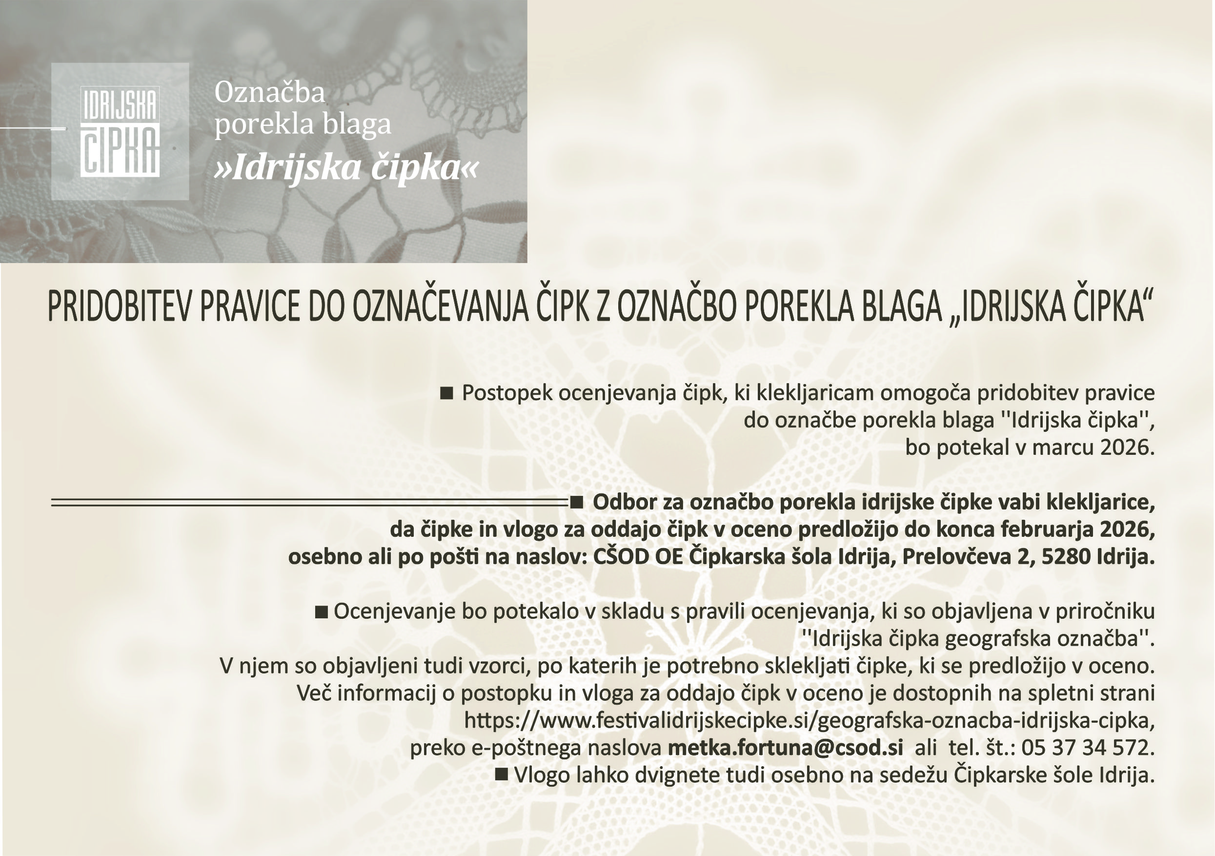 Vlogo za pridobitev dovoljenja za uporabo geografske označbe »Idrijska čipka« in čipke je potrebno oddati do konca februarja. Vloga se odda osebno ali pošlje po pošti na naslov: CŠOD OE Čipkarska šola Idrija, Prelovčeva 2, 5280 Idrija.